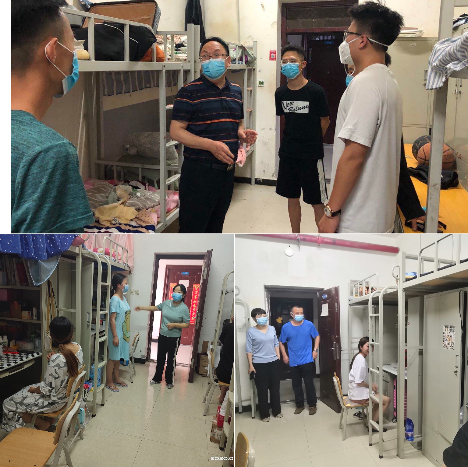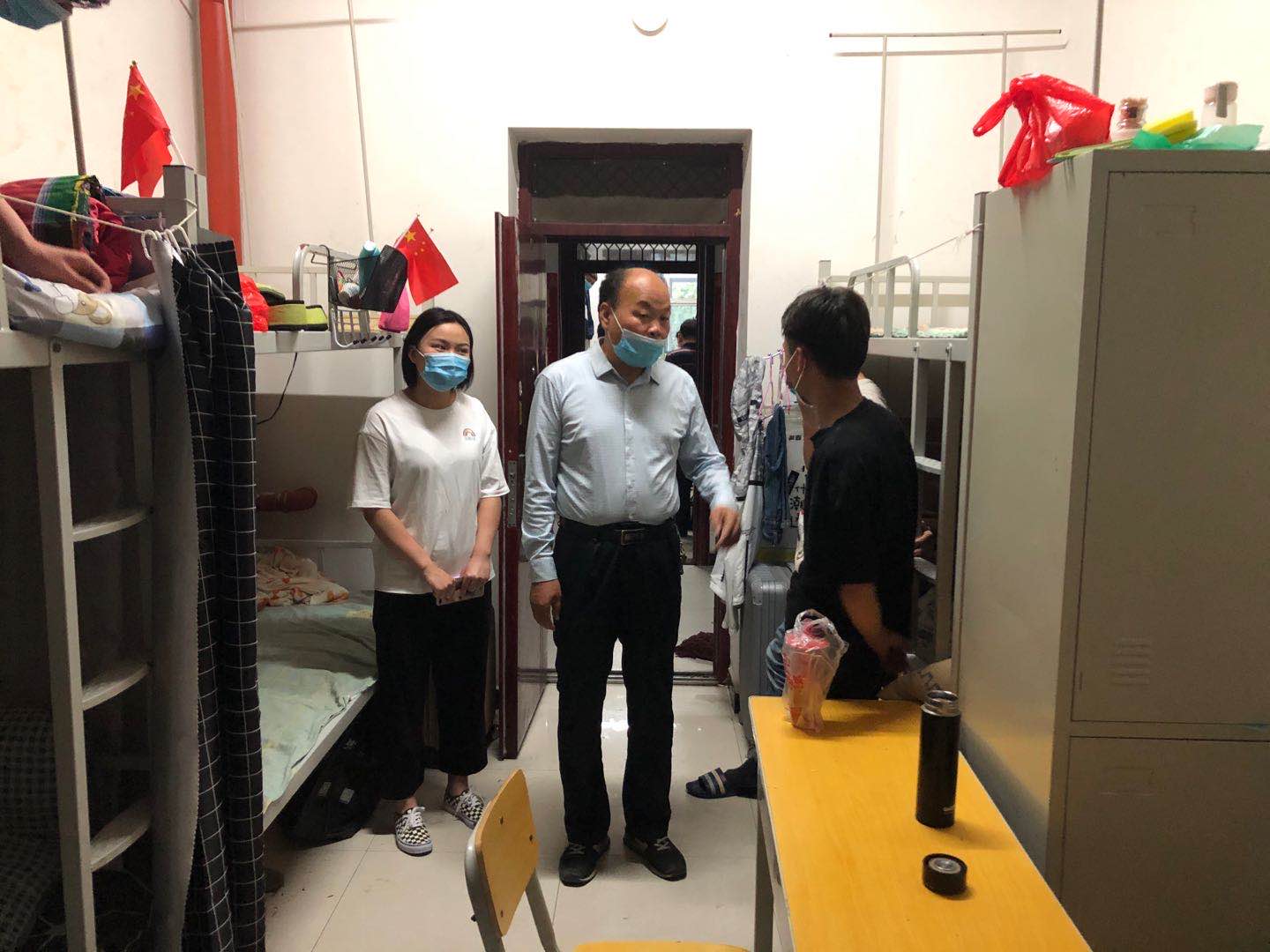 5月17日晚,pa电子官方网站党总支书记卢百龙、院长郭楚伟、副院长李有成、副书记黄翠萍、学生科科长陈旭铖、办公室主任李新萍前往学生宿舍楼看望返校学生并检查宿舍防疫工作。