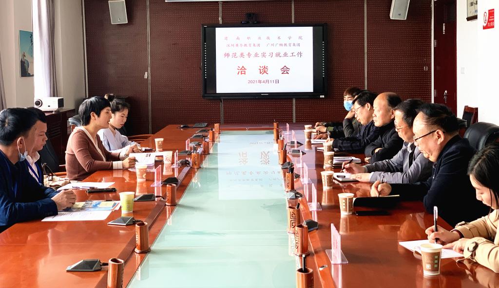 4月11日下午,pa电子官方网站与深圳市英华教育投资发展有限公司和广州广畅教育科技有限公司就师范类专业学生的实习和就业工作进行了洽谈。pa电子官方网站党总支部书记卢百龙、院长郭楚伟、副院长李有成,学校招就处处长宋长军、副处长舒新建及英华和广畅两家公司招聘负责人参加会议。