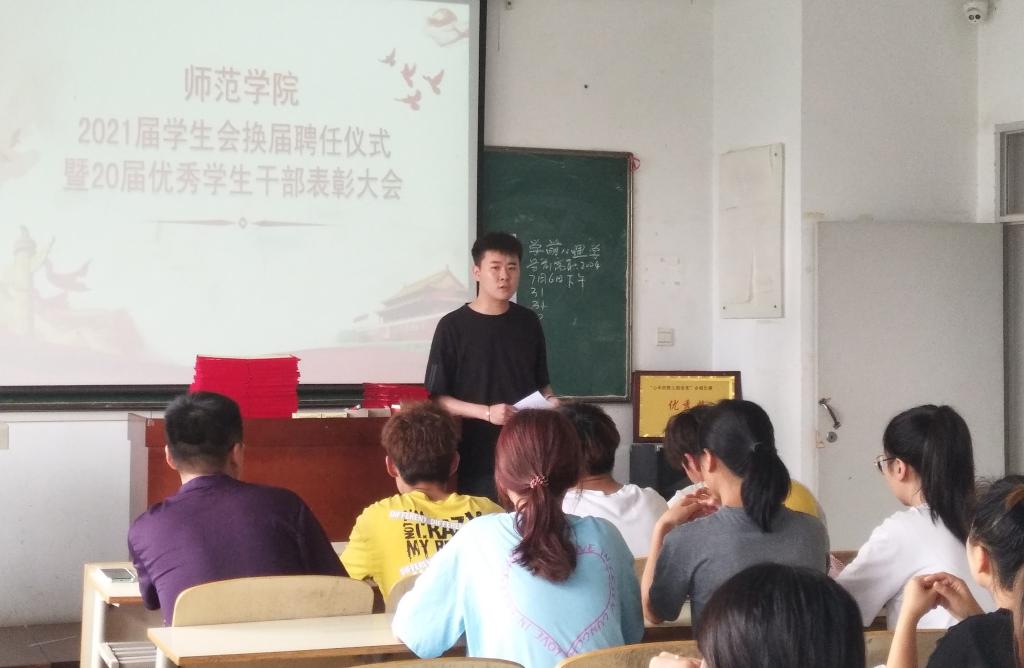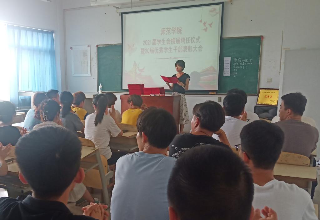 为促进pa电子官方网站德育工作发展,激发新的活力,弘扬积极进取、乐于奉献的学生组织精神,7月6日,pa电子官方网站2021届学生会换届聘任仪式暨20届优秀学生干部表彰大会在师范楼305室召开。全体辅导员及100余名学生代表参加大会。