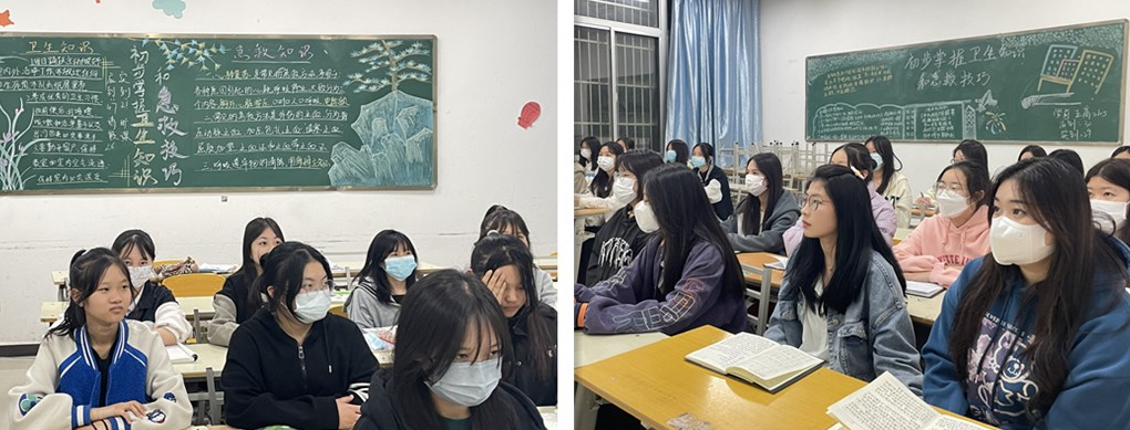 班会上各班长组织全体学生学习心肺复苏、气道异物梗阻、常见急诊与意外伤害等急救知识,通过播放相关视频对救助心脏骤停者的方法进行了详细解说,包括急救前的环境评估,现场施救应该注意的事项及规范的急救操作程序,为突发急症患者抢救赢取时间。通过“理论+操作”相结合的形式,同学们系统全面地学习救护知识和急救技能。