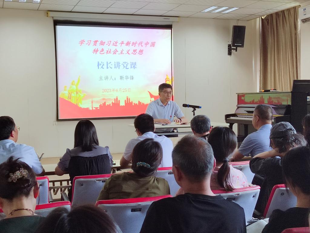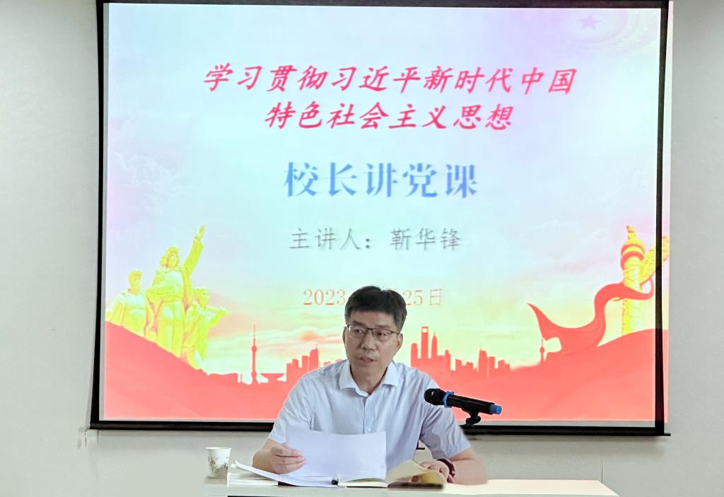 2023年6月25日下午,校长靳华锋来到pa电子官方网站,就学习贯彻习近平新时代中国特色社会主义思想,为pa电子官方网站党总支和党群党总支办公室支部50余名党员讲了一堂深刻而生动的党课。pa电子官方网站院长郭楚伟主持。