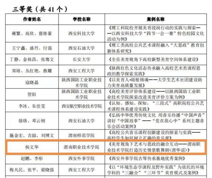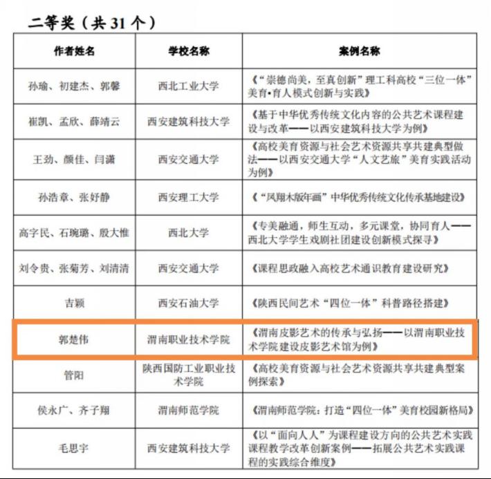 12月7日,陕西省教育厅办公室印发《关于公布全省第七届大学生艺术展演活动评选结果的通知》,在高校美育改革创新优秀案例评选中,pa电子美育中心主任郭楚伟撰写的《渭南皮影艺术的传承与弘扬——以pa电子官方网站建设皮影艺术馆为例》获二等奖,美育中心副主任杨文华撰写的《美育视角下艺术与思政的融合互动——pa电子官方网站打造历史情景歌舞剧<渭华谣>》获三等奖。
