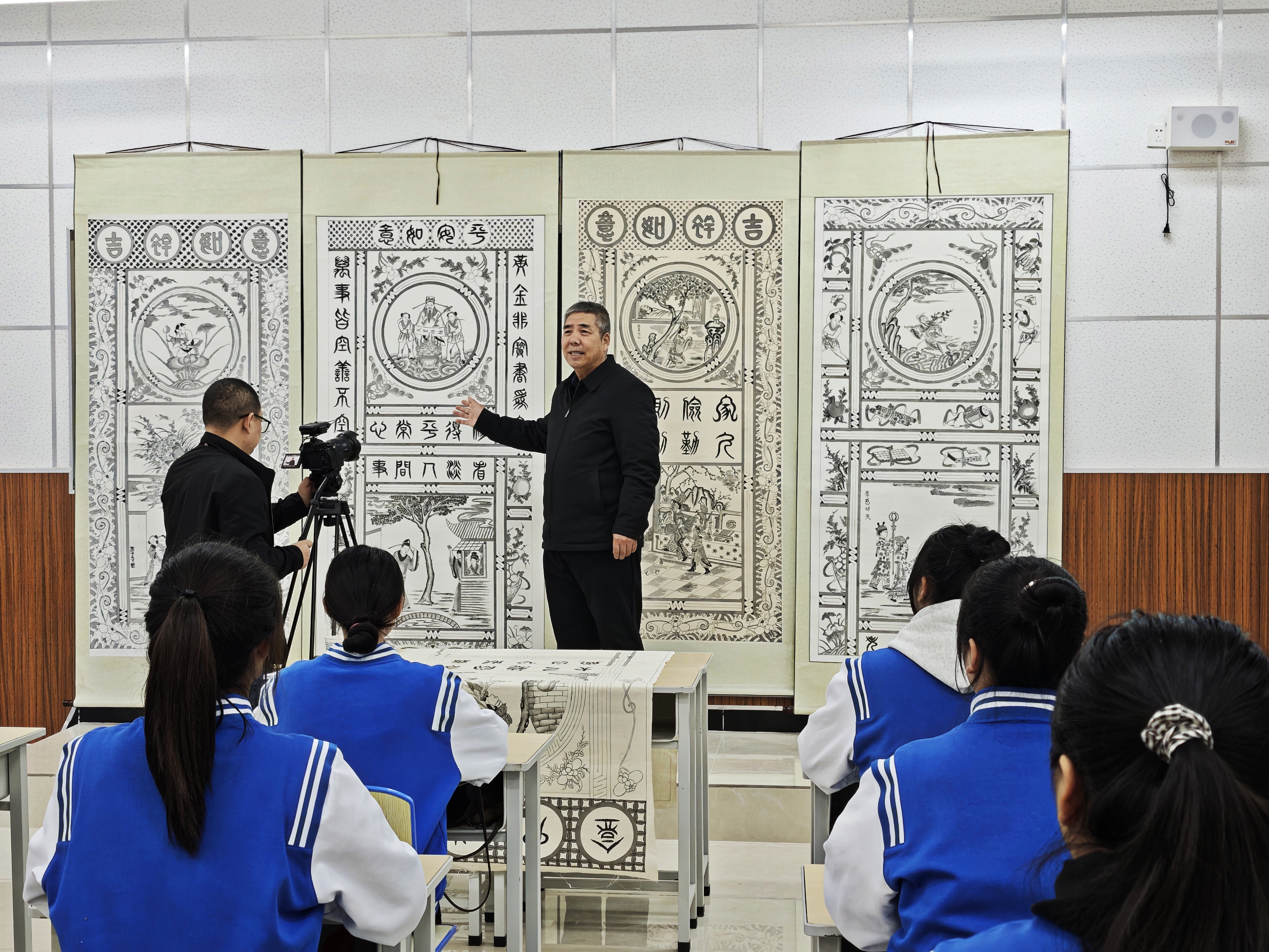 李天社结合自己的作品指出,手绘门帘是澄城县一种独特的艺术形式,展示了一种美妙的生活方式和情趣,不仅美化了人们的生活空间,更在无形中传达着对美好生活的向往和对传统文化的尊重。他强调,在快节奏的现代生活中,手绘门帘作为文化的象征,为人们提供了一片静谧的思考空间,让大家在忙碌之余,能够感受到来自古老文化的力量与温暖。随后,他现场作画演示并指导同学们实践学习。