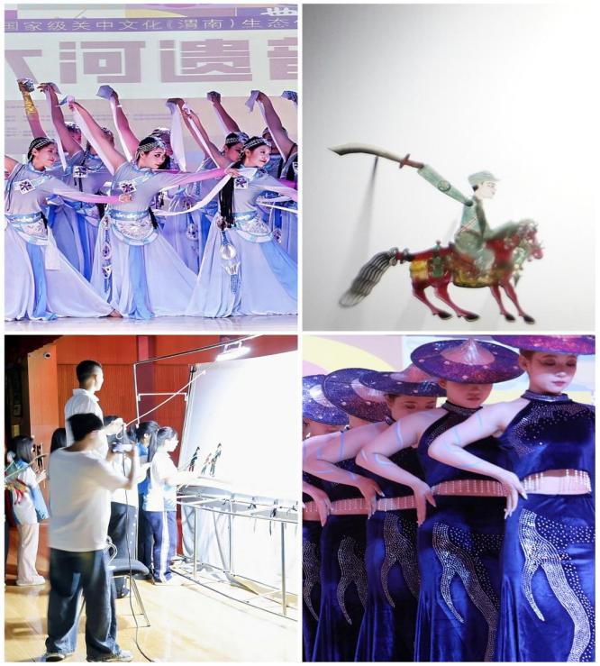 活动在pa电子学生表演的民族舞蹈《天浴》中开启。随后,宁夏的吴春杨、光素、赵畹茹,青海的贾瑞芸,甘肃的牛恬恬,陕西的韩文学、苏峰、王莹等8位宣讲团成员登台,为现场观众带来了一场别开生面的非遗盛宴。他们分别讲述了宁夏八宝茶的制作流程、宁夏手工毯的指尖技艺、宁夏滩羊的美食文化以及青海土族盘绣的绚丽多彩、甘肃环县道情皮影的优美唱腔和陕西仓颉造字的传奇故事、黄帝陵的文化意义和渭南丰富的非遗资源,从传统技艺的精湛呈现到文化象征的深刻解读,全方位、多角度地展现了黄河流域非物质文化遗产的独特魅力,令现场观众为之陶醉,掌声此起彼伏。pa电子皮影社团的学生也登台献艺,表演了皮影剧《抗战之歌》,生动展现了抗日战争时期先辈们英勇无畏、保家卫国的英雄事迹,体现了pa电子在非遗传承与教育方面取得的成果。
