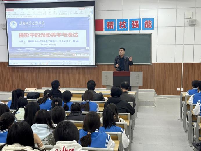 10月22日下午,美育中心在综合楼举办“青·蓝书苑”美育大讲堂第八期——《摄影中的光影美学与表达》专题讲座。校学生处处长、渭南市摄影家协会副主席罗峰主讲,180余名师生参加。